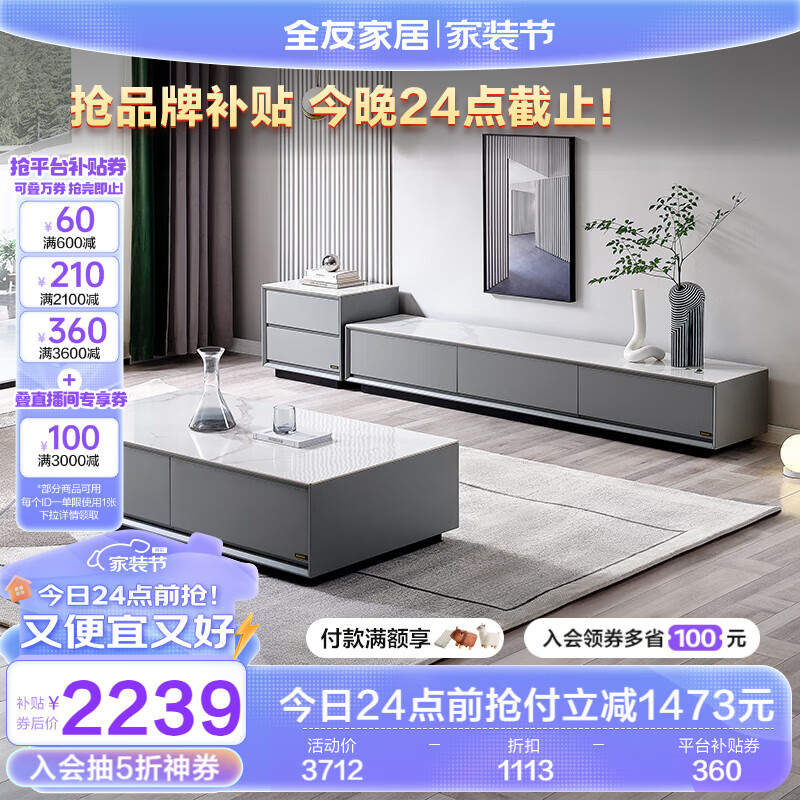 全友家居 现代简约岩板茶几电视柜组合客厅电视柜落地储物家具DW1055价格:3712.86元!
