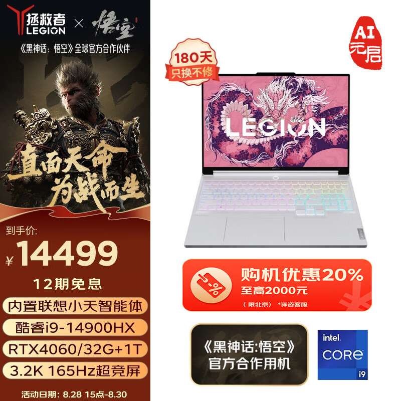 联想(Lenovo)畅玩 黑神话悟空官方合作 拯救者Y9000X AI元启 游戏笔记本电脑i9-14900HX 32G 1T RTX4060 3.2K屏价格:14499.00元!