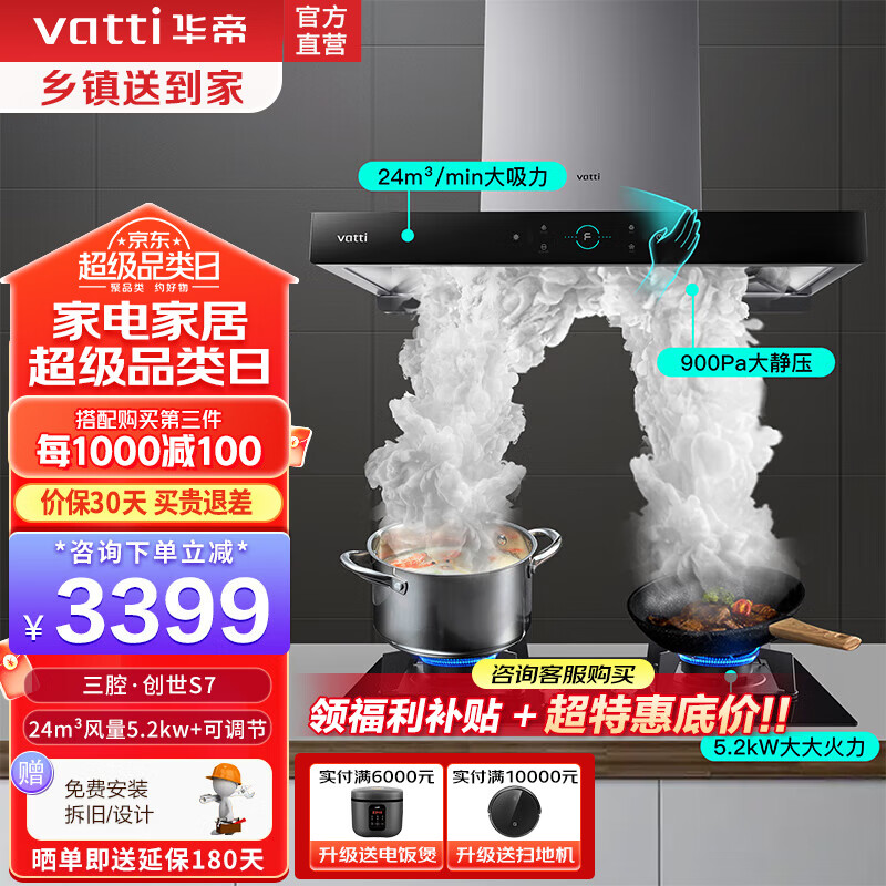 华帝(VATTI)【性价比】欧式抽油烟机灶具套装官方i11207三腔·创世S7顶吸24风量搭配5.2kW灶具 厨房套装多件套 S7+75B烟灶套装 天然气价格:3699.00元!