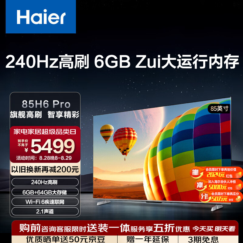 海尔(Haier)85H6 Pro 85英寸电视 4K超高清240Hz屏 6+64GB 大屏电视智能液晶平板电视机以旧换新价格:5499.00元!