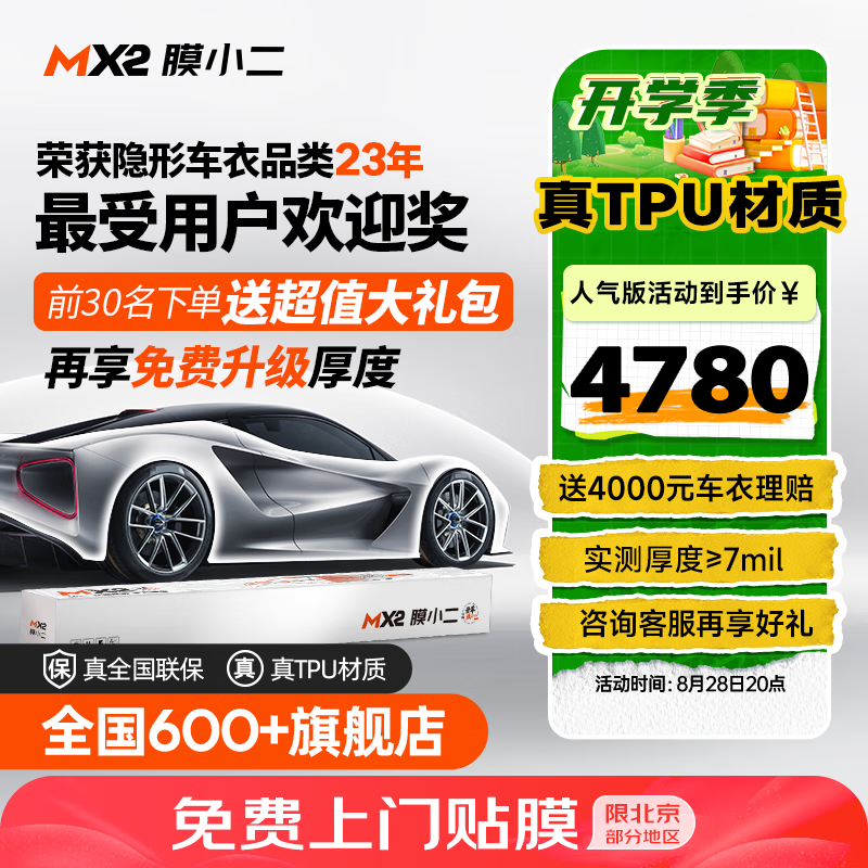 膜小二(MOXIAOER)隐形车衣膜全车身膜TPU材质防刮蹭透明膜车衣漆面保护膜包施工价格:4780.00元!