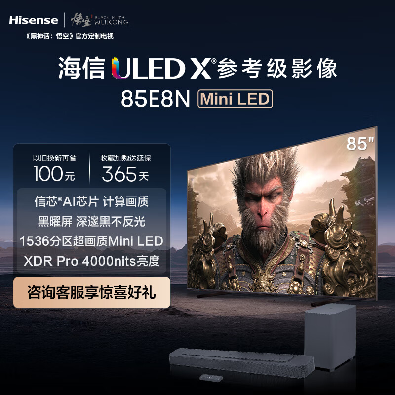 海信电视85E8N+Bar500沉浸追剧套装 85英寸 ULED X 1536分区Mini LED 游戏智慧屏 液晶平板电视价格:12298.00元!