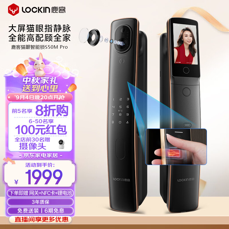 鹿客(lockin)S50MPro琥珀金可视猫眼室内大屏指静脉智能锁指纹锁支持APP联动价格:2499.00元!