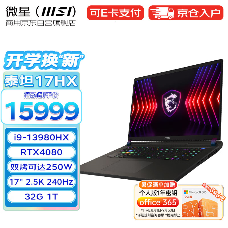 微星(MSI)泰坦17HX 酷睿i9 17英寸设计剪辑办公笔记本电脑(i9-13980HX 32G 1T RTX4080 2.5K 240Hz)定制价格:15999.00元!