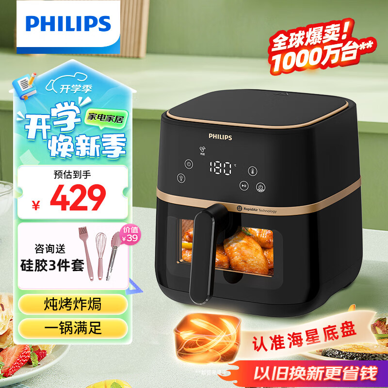 飞利浦(PHILIPS)空气炸锅家用5L大容量 可视 不用翻面 智能液晶触控 宽温域多功能电炸锅HD9455/80价格:429.00元!