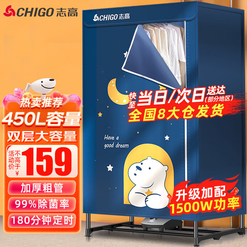 志高(CHIGO)干衣机烘干机 家用衣服干衣机婴儿衣物暖风烘衣机风干机1500W大功率35斤容量可定时烘干衣柜JT16价格:199.00元!