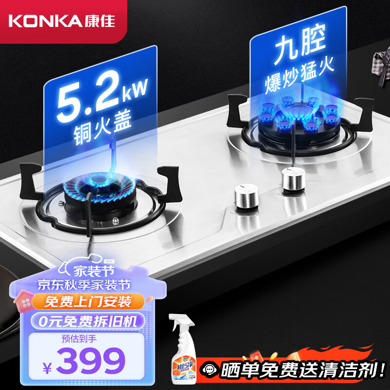康佳(KONKA)燃气灶双灶 家用5.2kW九孔聚能猛火爆炒鸳鸯灶具 台式/嵌入式不锈钢灶台 JZT-G900Y(天然气)价格:399.00元!