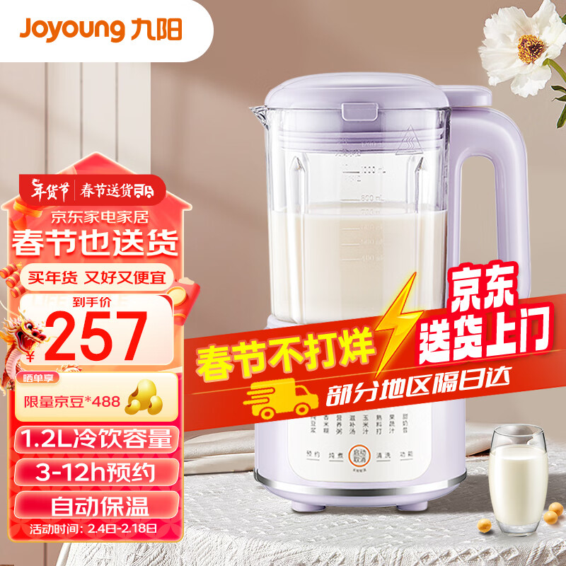 九阳(Joyoung)豆浆机1.2L 家庭容量细腻免滤预约时间一键清洗 家用多功能破壁机料理机榨汁机价格:257.00元!