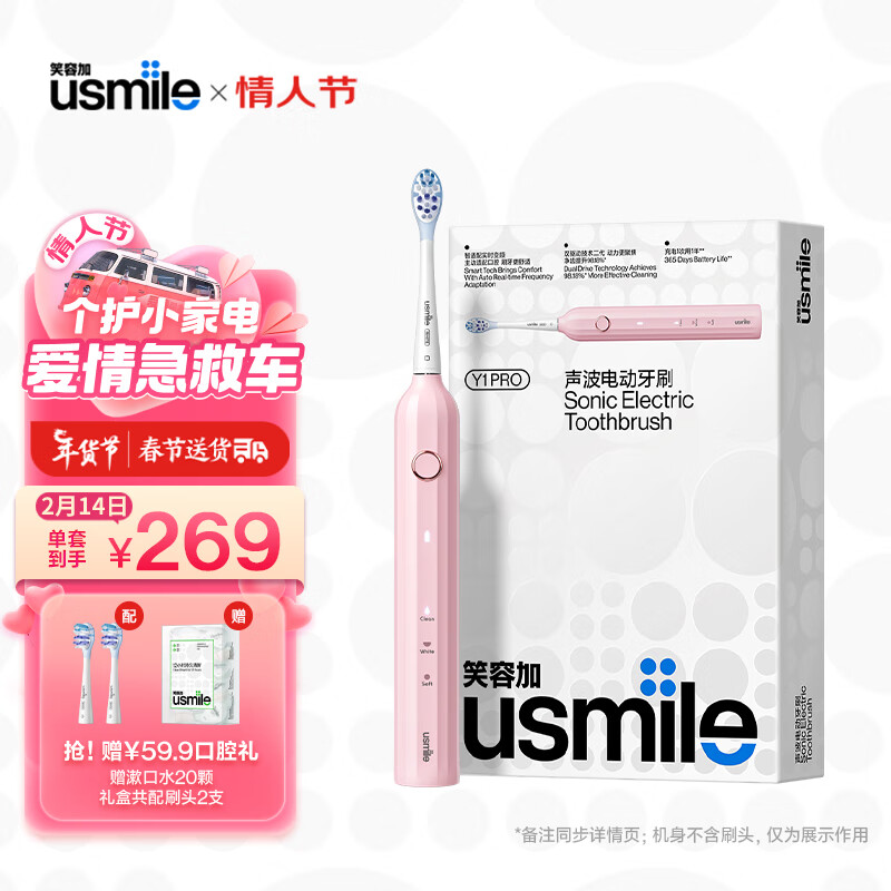 usmile 笑容加 电动牙刷 成人声波震动 情侣电动牙刷 送男友/送女友 Y1Pro蜜粉价格:269.00元!