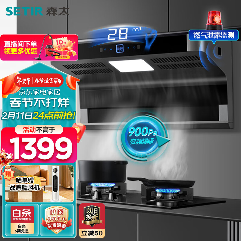 森太(SETIR)抽油烟机 顶侧双吸直流变频7字型油烟机1000Pa增压家用吸油烟机 【800宽小尺寸户型】B812BQL 【28立方智能变频】价格:1799.00元!