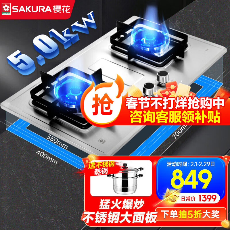 樱花(SAKURA)燃气灶家用双灶煤气灶台嵌两用不锈钢灶台嵌入式燃气灶一级能效大尺寸多开孔超宽边底壳猛火灶 PSC01【液化气】5.0KW大火力多开孔尺寸安装价格:1299.00元!