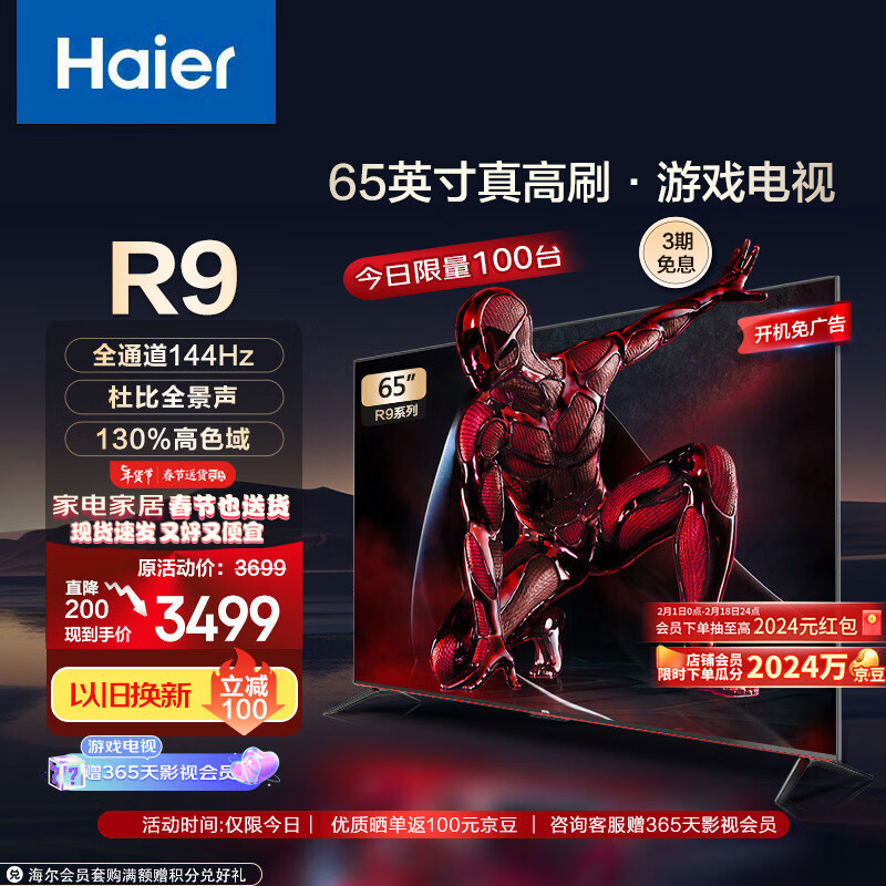 海尔(Haier)65R9 65英寸大屏游戏电视 全通道144Hz高刷 4GB+64GB大内存 4K超高清智能客厅液晶平板电视机价格:3499.00元!