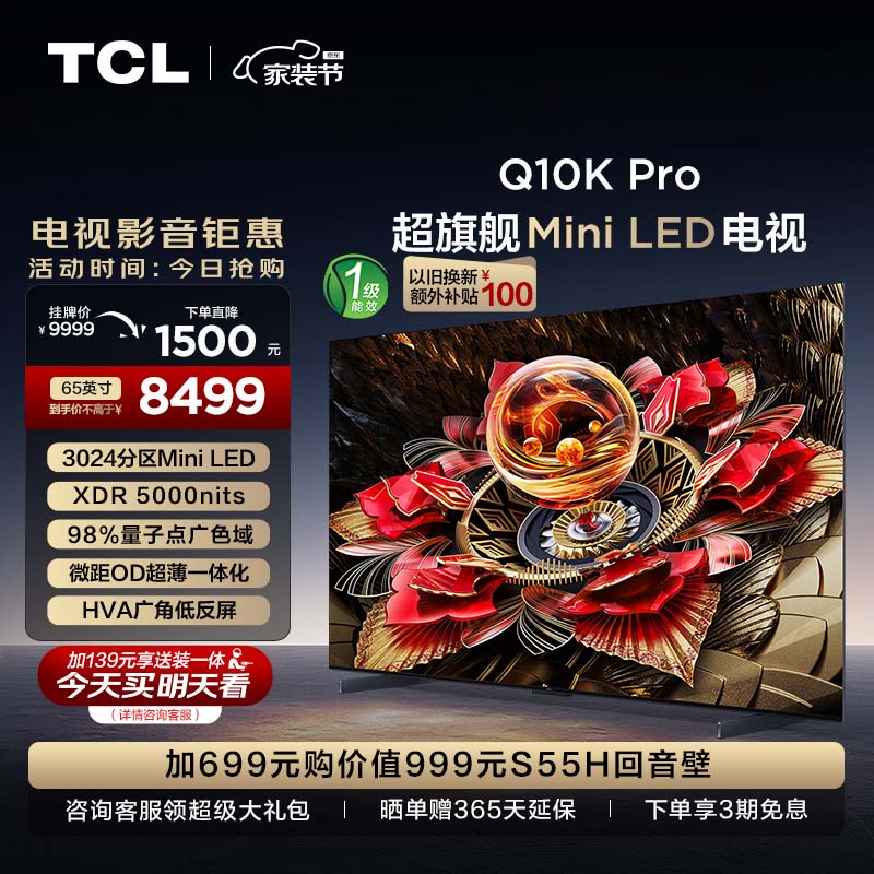TCL电视 65Q10K Pro 65英寸 Mini LED 3024分区 XDR 5000nits QLED量子点 超薄 北京以旧换新一级能效价格:8499.00元!