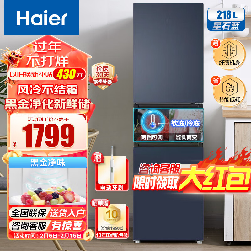 海尔(Haier)218升冰箱 三门超薄小型迷你家用风冷无霜冰箱 黑金净化 独立中门变温 节能低噪 租房公寓电冰箱价格:1799.00元!