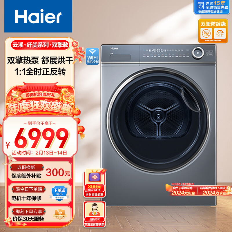 海尔(Haier)云溪176XS烘干机家用 10公斤双擎热泵干衣机 一件智烘 羊毛烘 空净过滤 EHGS100176XSU1以旧换新价格:6999.00元!