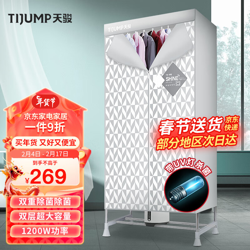 天骏小天使(TIJUMP)烘干机家用干衣机 UV紫外线杀菌内衣裤消毒机婴儿衣物布罩类干衣柜双层大容量TJ-SM380E价格:299.00元!