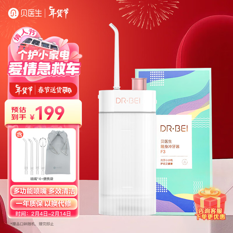贝医生(DR·BEI) 冲牙器便携家用洗牙器洁牙器水牙线清洁口腔牙套 国货旅行洗漱套装 清洁亮白护龈 送女友新年礼物 抽拉便携冲牙器F3【内配4喷嘴】 4支喷头价格:299.00元!