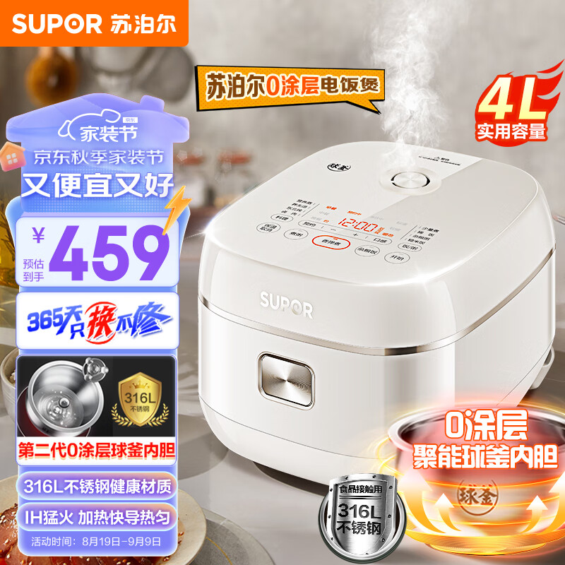 苏泊尔(SUPOR)电饭煲 电饭锅 4L IH电磁加热 0涂层316L不锈钢球釜内胆 家用2-7人 大火力 智能 SF40HC0994价格:429.00元!