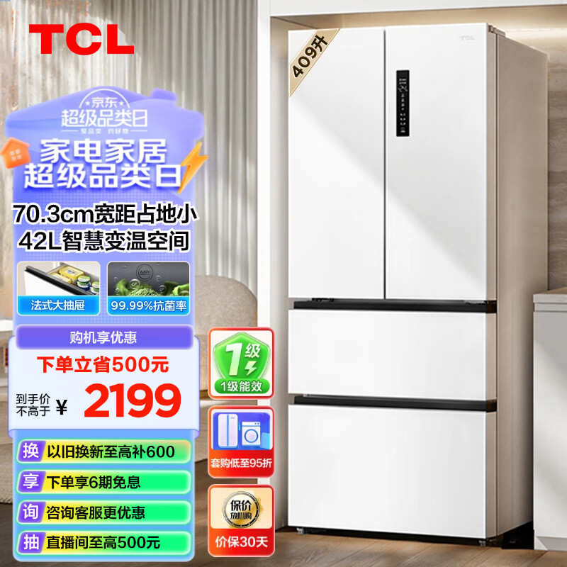 TCL 409升白色法式多门四开门对开门家用电冰箱风冷无霜一级能效双变频智慧变温空间深冷速冻R409V5-D价格:2199.00元!
