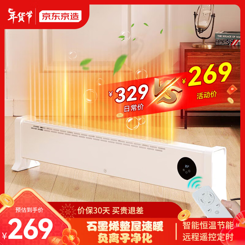 京东京造 石墨烯踢脚线取暖器/电暖器/暖风机/电暖气 负离子净化清新空气 轻音降噪 节能恒温 远程遥控价格:269.00元!