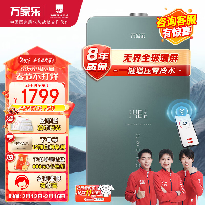 万家乐 16升零冷水燃气热水器天然气佛山标准产品京东小家智能增压超级大水量以旧换新JSQ30-16DL3价格:1799.00元!