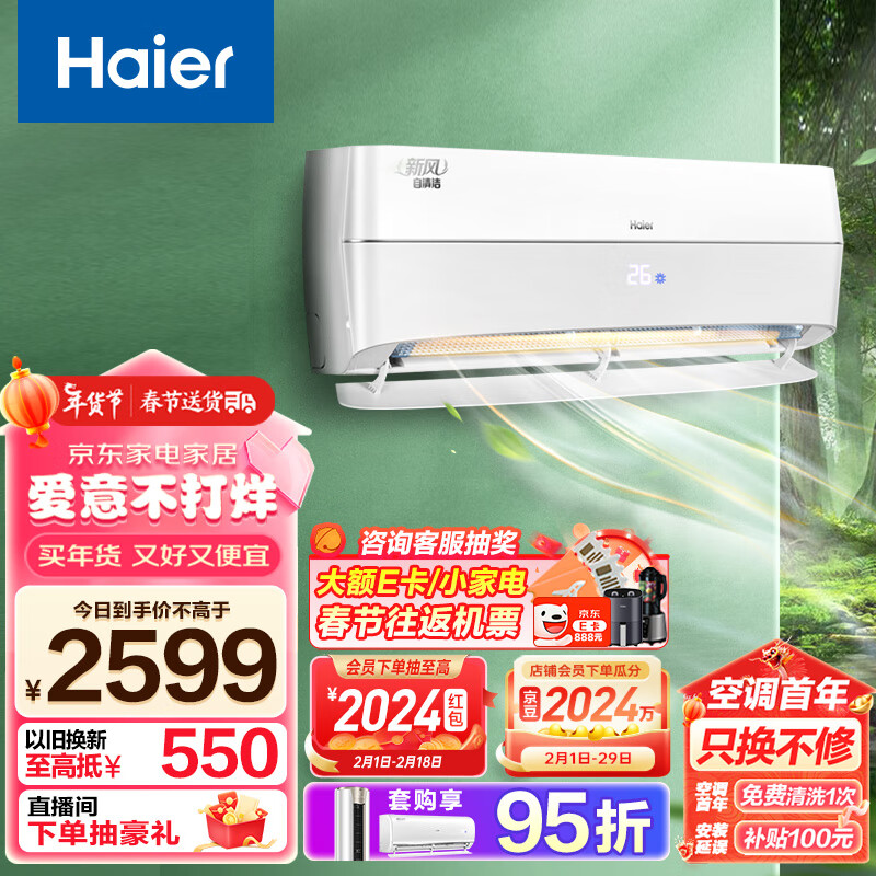 海尔(Haier)大1匹 新风空调新一级能效卧室壁挂式空调变频挂机 京东小家智能 KFR-26GW/10AFA81U1 以旧换新价格:2547.20元!