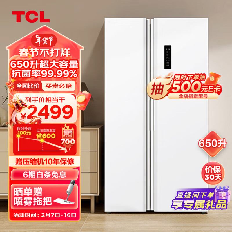 TCL650升T5超大容量对开双开门多门白色冰箱一级能效 风冷无霜 一体双变频 家用电冰箱R650T5-S芭蕾白价格:2499.00元!