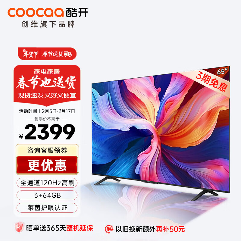 酷开创维K3 Pro 65英寸电视 120Hz高刷 3+64G 4K护眼 声控投屏液晶平板游戏电视机以旧换新65P3D Max价格:2999.00元!