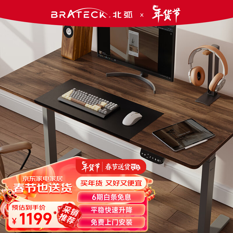 Brateck电动升降电脑桌 北弧站立办公书桌 工作升降台 K2棕1.5米价格:1559.00元!