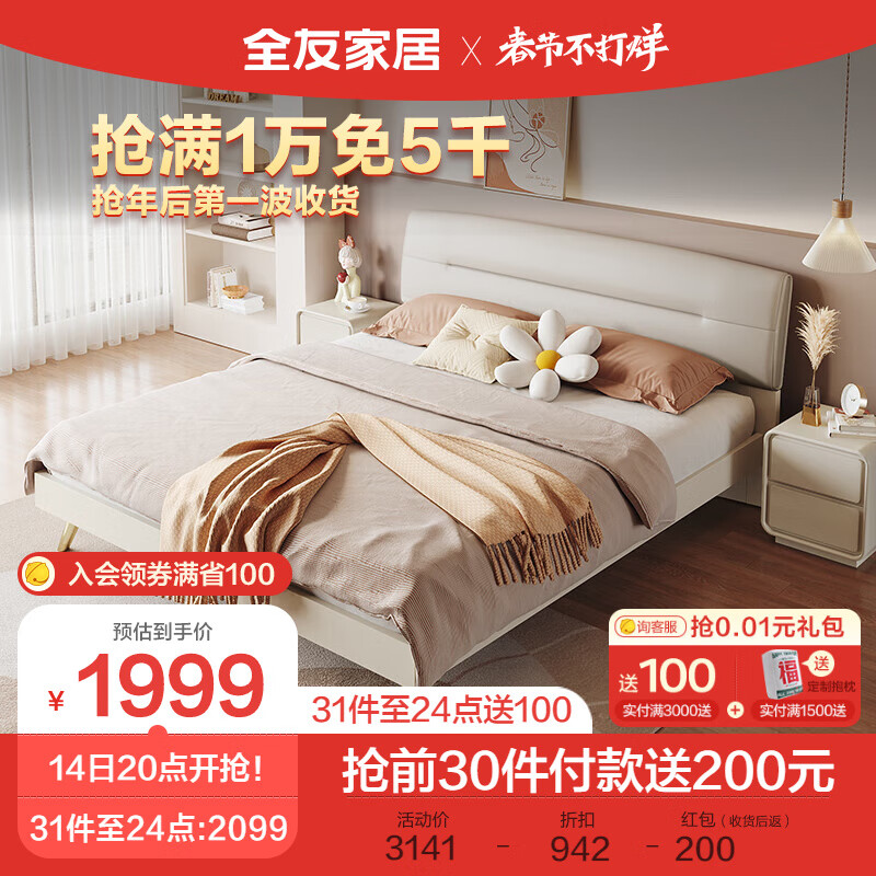 全友家居 床现代轻奢肤感科技布床双人床1.5x2米卧室软靠大床DG10001价格:3141.43元!