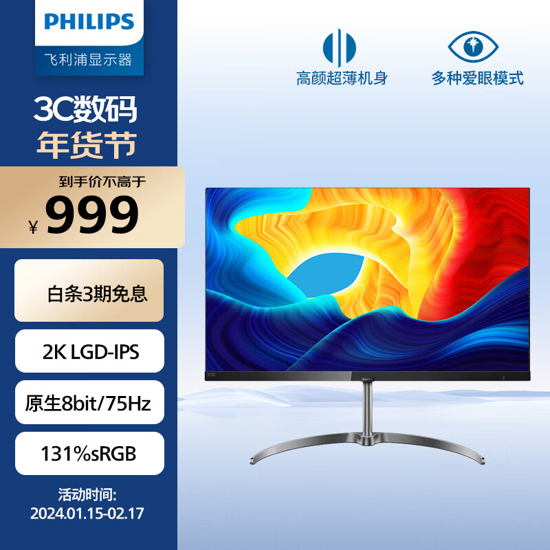 飞利浦 27英寸 LGD-IPS悬浮屏 2K超薄75Hz 131%sRGB广色域金属支架底座高清设计娱乐办公显示器275E9价格:1099.00元!