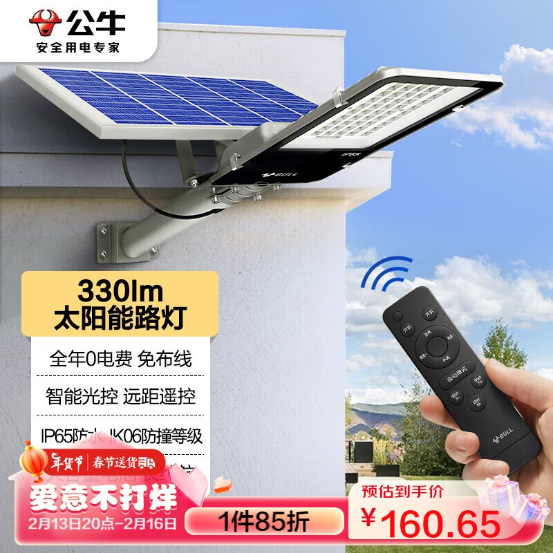 公牛(BULL)太阳能路灯户外庭院灯防水防撞智能光控MG-C120B-AE光通量330lm价格:189.00元!