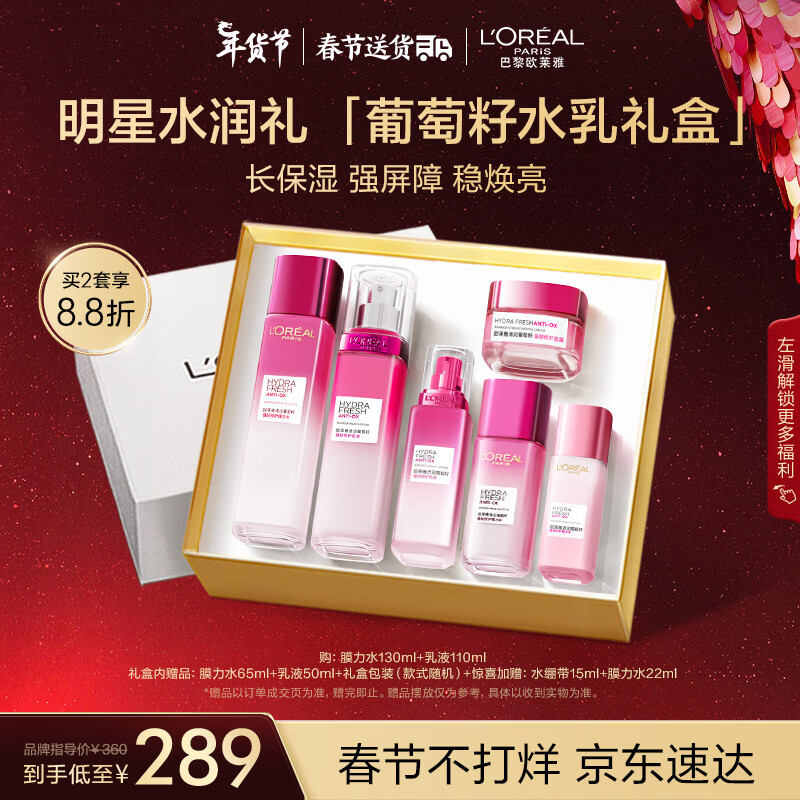 欧莱雅葡萄籽水乳套装 补水保湿提亮护肤品套装情人节新年礼物送女友价格:289.00元!