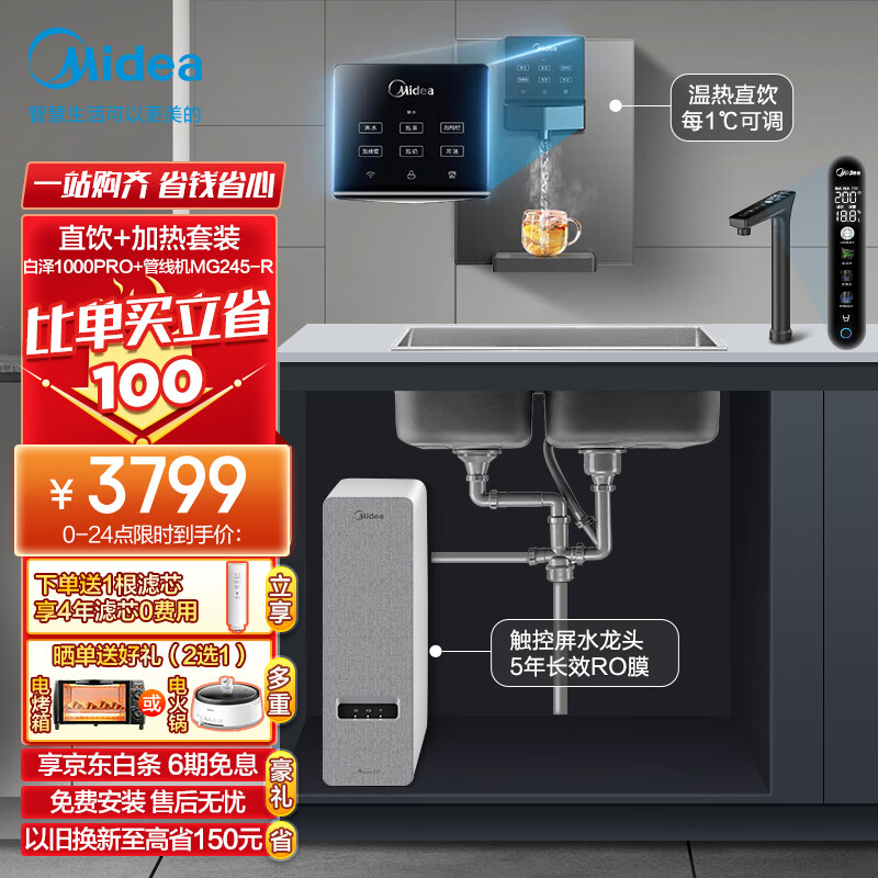 美的(Midea)直饮加热净水器套装【白泽1000Gpro+管线机MG245-R(908A升级款)】厨下RO 家用即热一体净饮机价格:3799.00元!