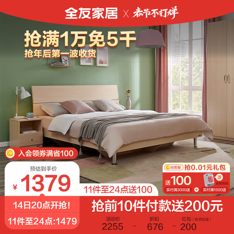 全友家居 床现代简约卧室双人床分段床屏主卧室成套家具板式床106302价格:2255.71元!