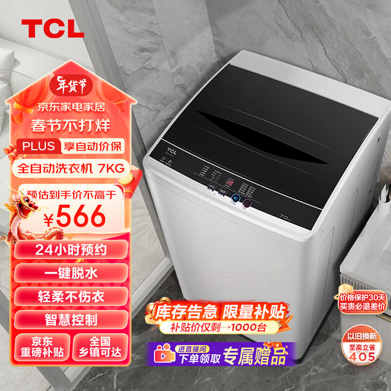 TCL 7KG全自动波轮洗衣机 模糊控制 波轮小型洗衣机 一键脱水 24小时预约 便捷洗衣机XQB70-36SP价格:566.00元!