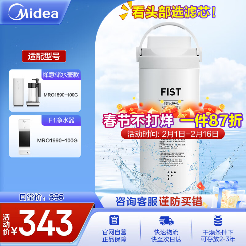 美的净水器滤芯—适用于禅意台面储水壶款(MRO1890-100G)、F1(MRO1990-100G)净水机通用一体芯系列价格:343.00元!