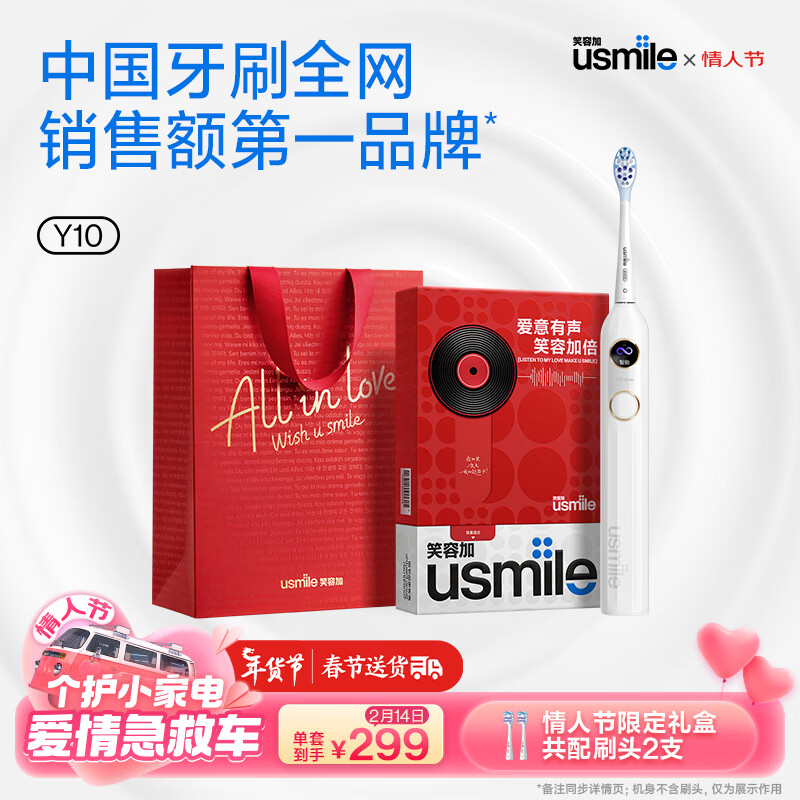 usmile 笑容加电动牙刷 成人声波震动电动牙刷 情侣款送男友/送女友 Y10水白色 新年情人节礼物价格:346.30元!