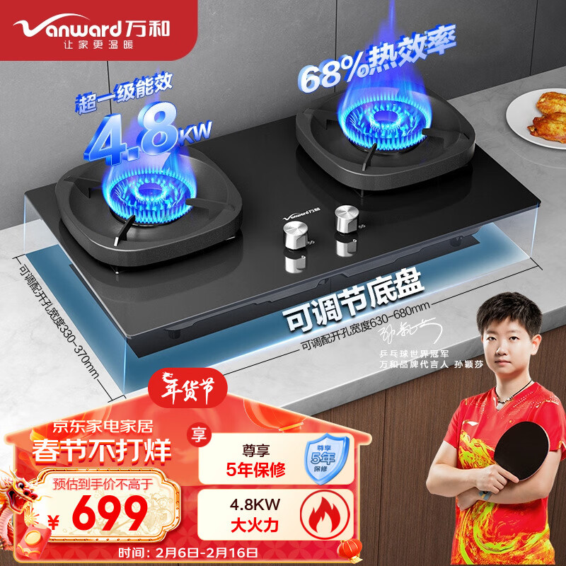 万和(Vanward)燃气灶4.8kW大火力嵌入式台式两用灶具家用双灶68%高热效率 超一级能效 JZY-G6L50(液化气)价格:699.00元!