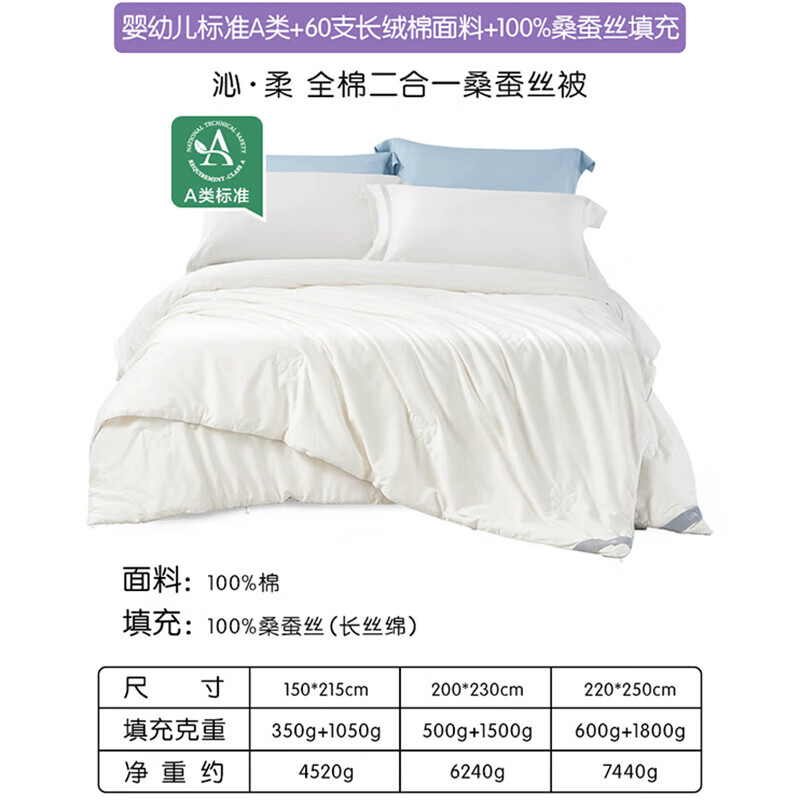 罗莱儿童 沁柔 母婴A类60支纯棉100%桑蚕丝被 子母被 12斤200*230cm白色价格:3999.00元!