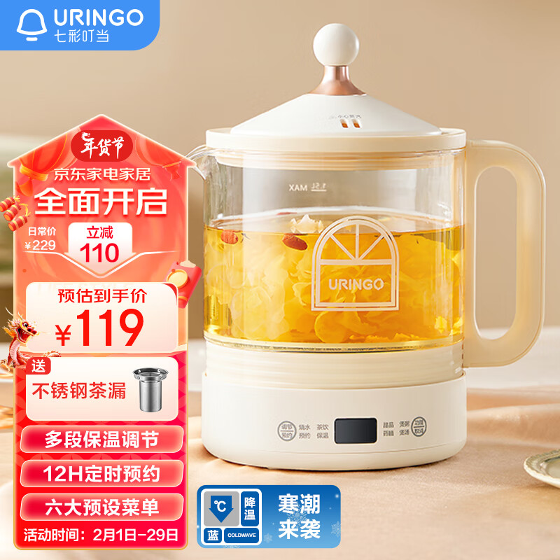 七彩叮当(URINGO)养生壶煮茶器大容量电热水壶 1.5L恒温水壶养生家用烧水壶米白色标准款YSH03价格:118.00元!