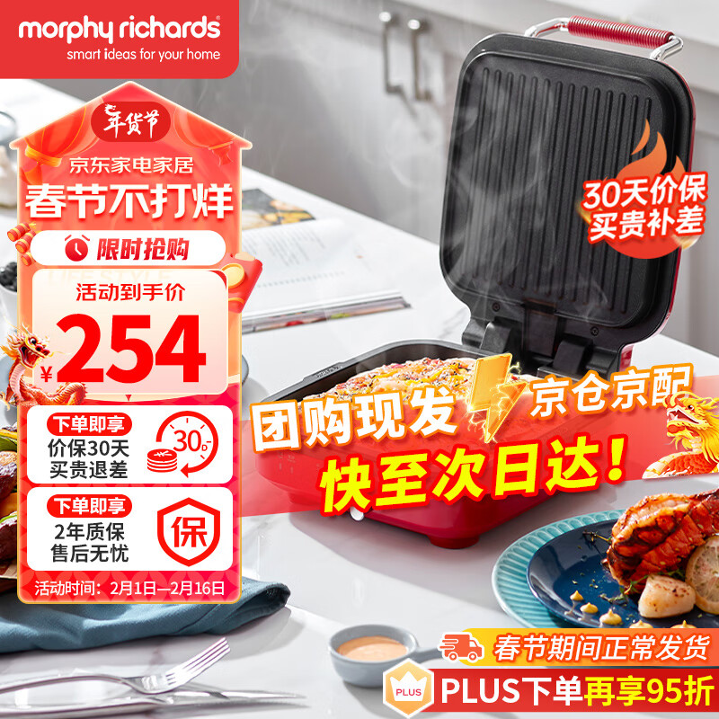 摩飞电器(Morphyrichards)电饼铛 家用双面加热大火力三明治早餐机 下盘可拆卸面包吐司煎烤机烙饼锅 MR8600高贵红价格:254.00元!
