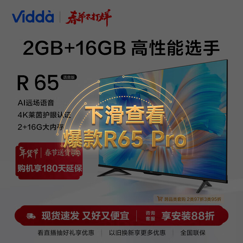 Vidda 海信 R65 语音款 65英寸 超高清 屏电视 超薄电视 2G+16G 智能液晶巨幕电视以旧换新65V1H-R价格:1999.00元!