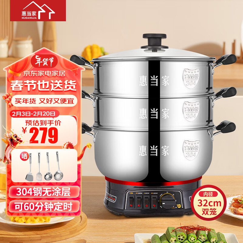 惠当家(Hui Dang Jia)电锅多功能电热锅定时电煮蒸锅电炒锅多用途锅电火锅304不锈钢锅 32cm双笼【定时款】价格:279.00元!