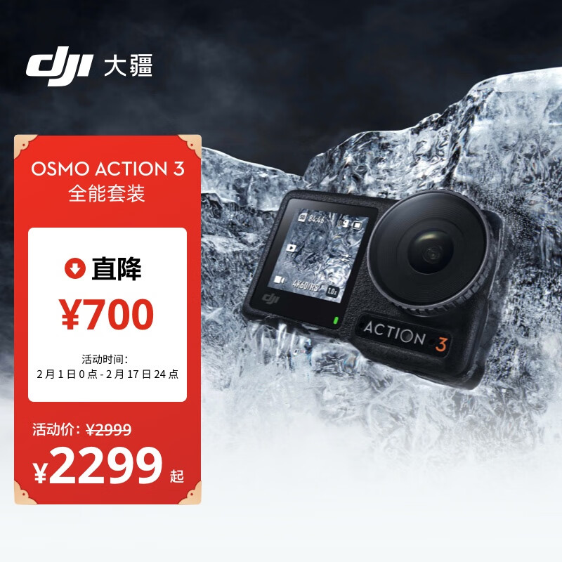 大疆 DJI Osmo Action 3 全能套装 运动相机 长续航4K高清防抖手持vlog摄像机便携式+随心换2年版价格:2488.00元!