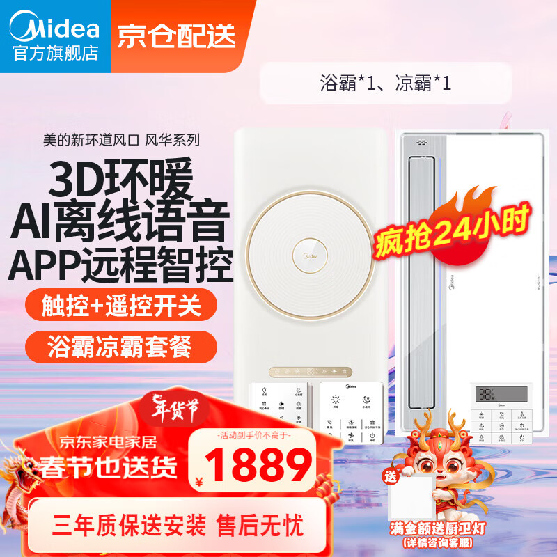 美的(Midea)浴霸风暖集卫生间成吊顶暖风机浴室智能环形双电机语音双控取暖器价格:1889.00元!