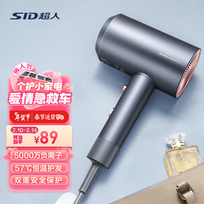 超人电吹风家用吹风机大功率负离子大风力速干低噪音便携吹风筒 DJ818金釉蓝价格:109.00元!