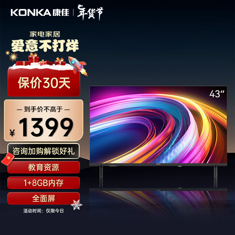 康佳电视 Y43 43英寸 1+8GB内存 屏 教育资源 网络WIFI 平板全高清液晶卧室教育电视机 以旧换新价格:1399.00元!