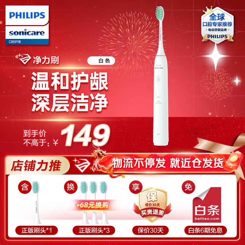 飞利浦(PHILIPS)电动牙刷 声波震动成人充电式软毛牙刷 情侣新年礼物送男友/女友 洁齿护龈【情人节礼物】 净力刷丨2种模式丨白色HX2431/02价格:209.00元!
