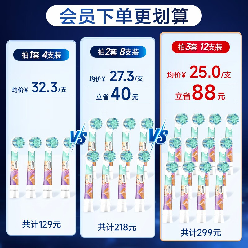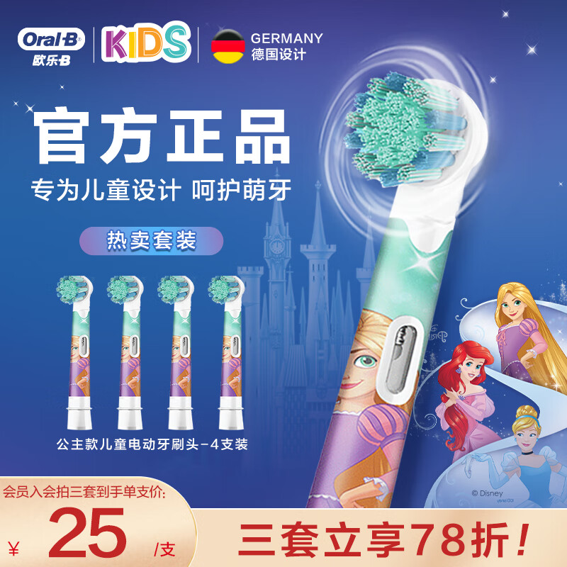 欧乐B儿童电动牙刷头4支装适用D103KD100KPro1kid公主款EB10/EB10S-4K德国进口软毛(图案包装随机发)价格:129.00元!
